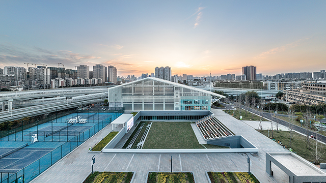 基于對(duì)項(xiàng)目定位的理解和把控,團(tuán)隊(duì)打破了傳統(tǒng)體育館彰顯結(jié)構(gòu)力量的表達(dá)方式,提煉川西傳統(tǒng)民居“坡屋頂”的形象語(yǔ)言,以低調(diào)適度的體量,謙遜內(nèi)斂的形態(tài),呈現(xiàn)了一種更加內(nèi)在、含蓄的美。