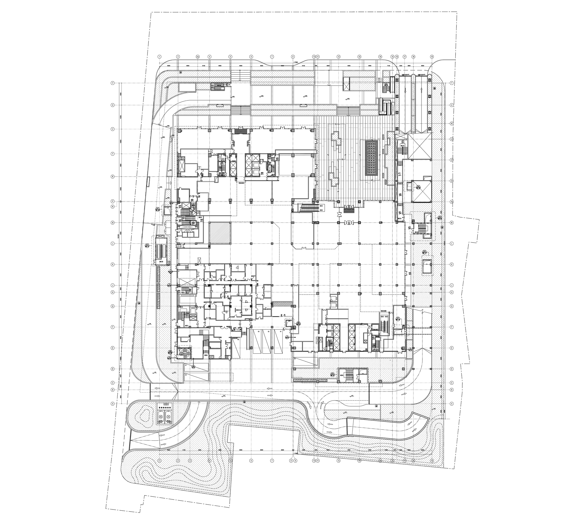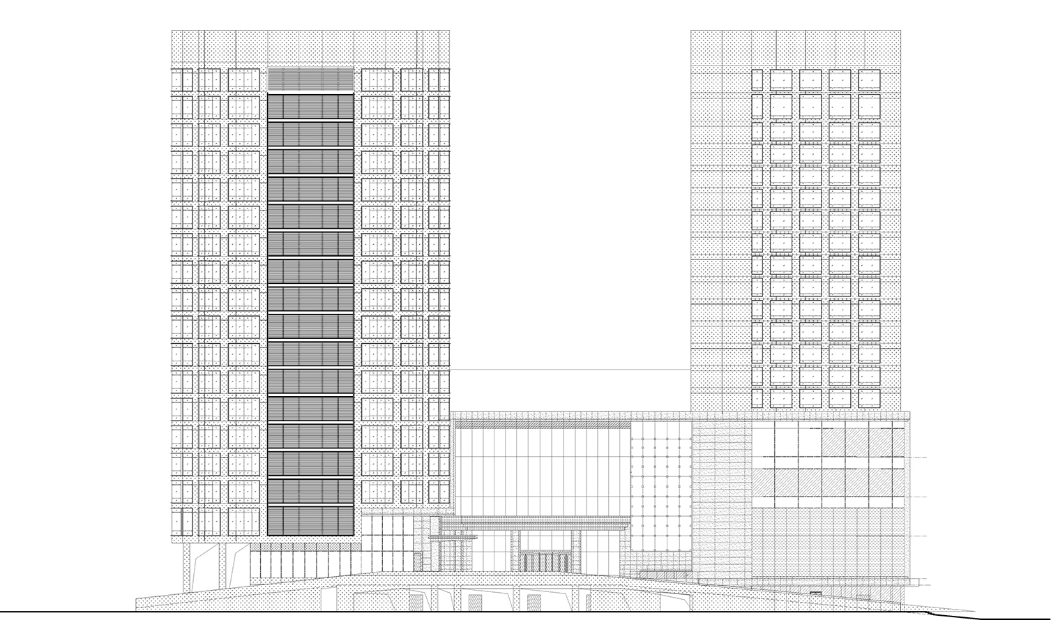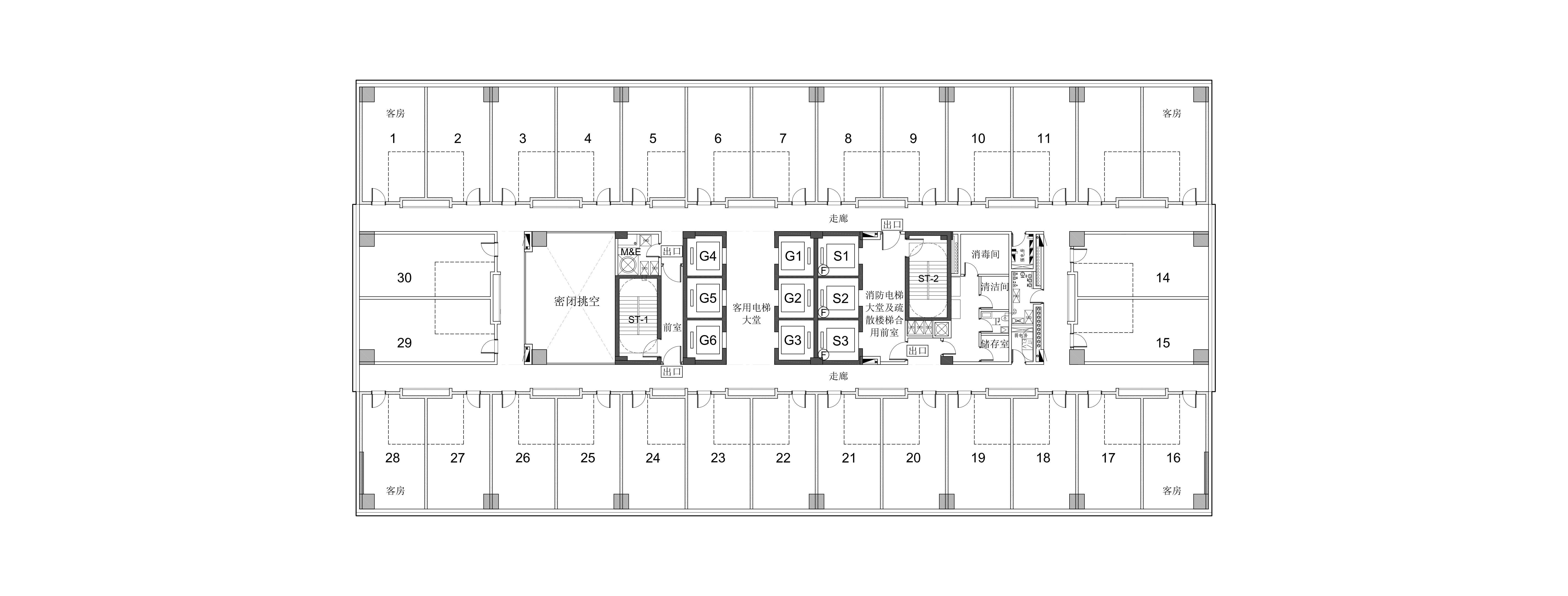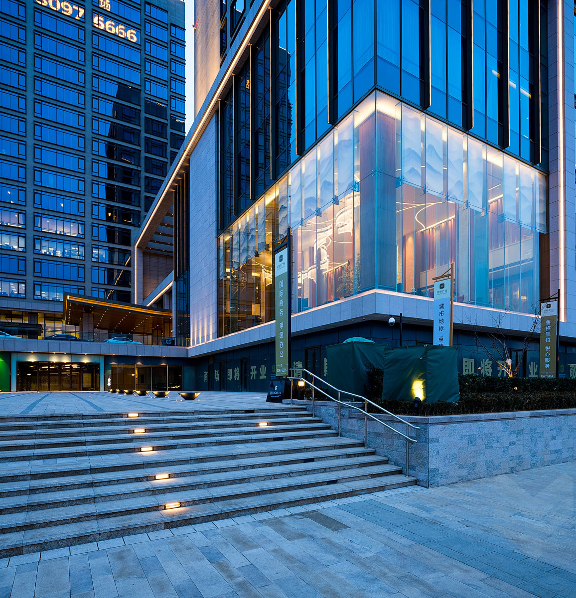 北側(cè)酒店塔樓面向泉城廣場, 使得客房居住者在盡享泉城廣場的同時, 亦可遠(yuǎn)眺大明湖。酒店諸如餐飲等重要功能,亦能享受泉城廣場景色及首層室外綠化廣場景色。南側(cè)位置較幽靜,在布局上設(shè)置為辦公區(qū)域,主立面亦面向泉城廣場。兩棟建筑與其他周圍建筑保持適當(dāng)距離, 避免由于間距過近而造成的互望弊端。