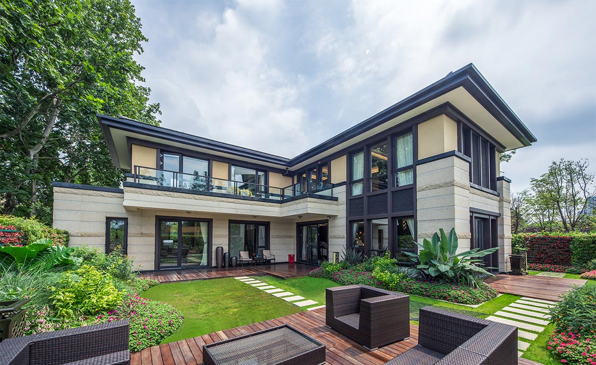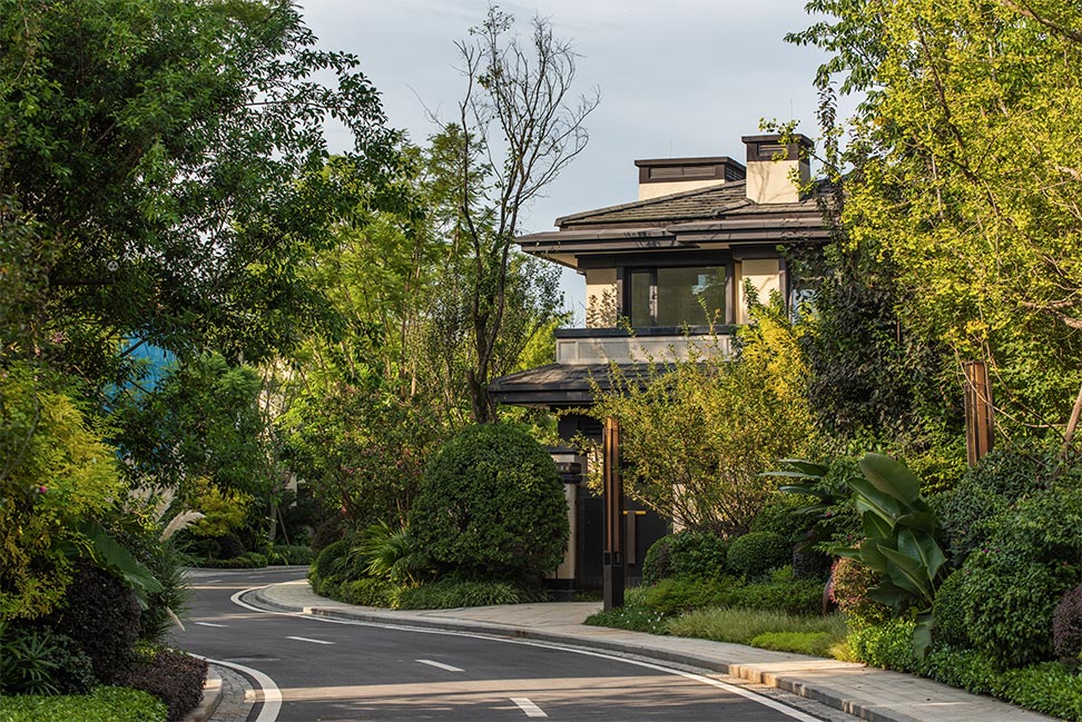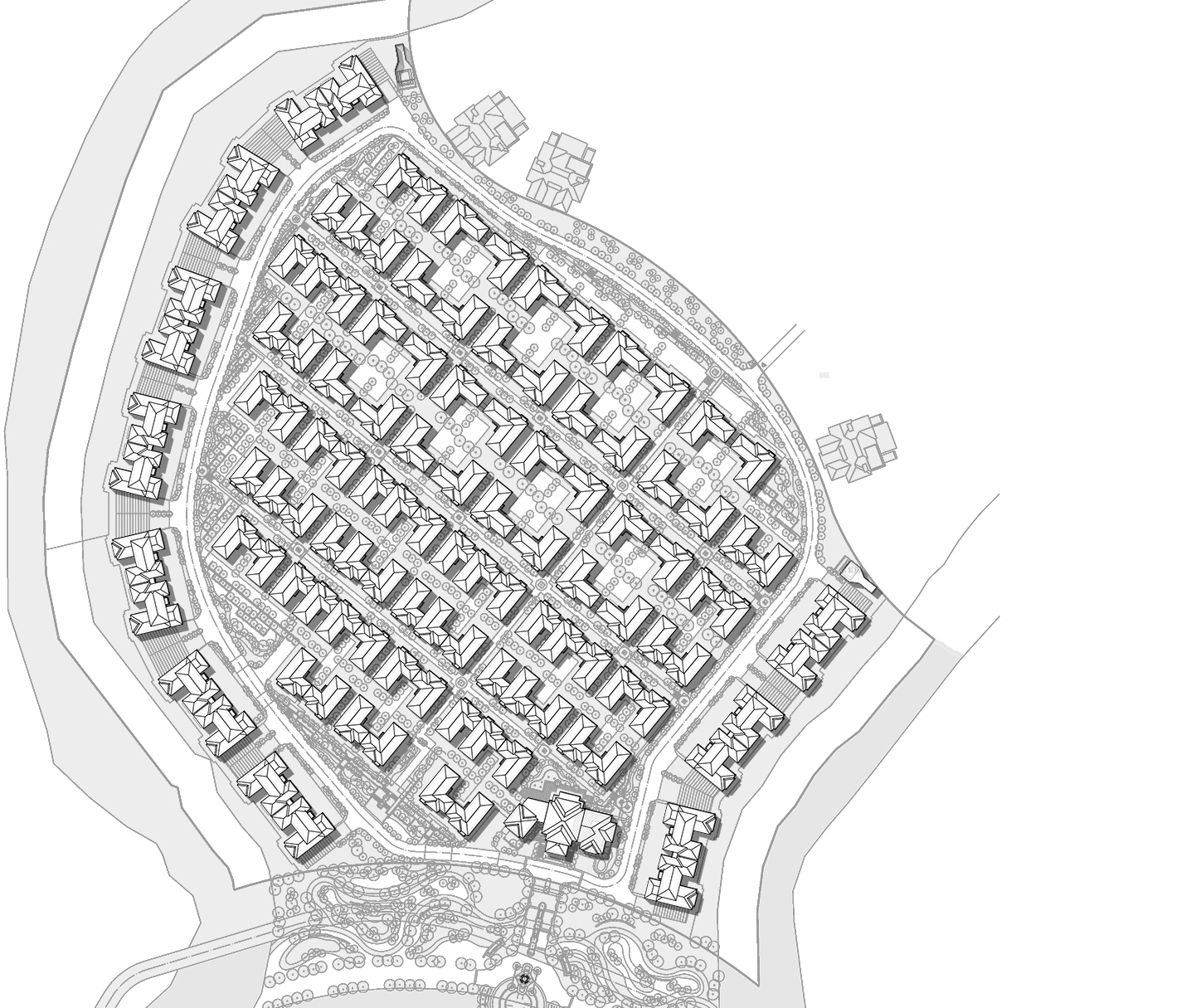 項目位于成都市金牛區(qū),為華僑城東岸六期地塊,三面臨水,南側(cè)為項目已建內(nèi)部道路。占地84,506平方米,有一層地下室,地面上由41棟2層住宅、10棟3層住宅和1棟2層服務(wù)用房構(gòu)成,總建筑面積:65,878平方米,其中地面以上30,000平方米 ,項目用地東西兩側(cè)靠景觀內(nèi)河,沿兩側(cè)布置大戶型住宅,保證大戶型住宅在小區(qū)中享有最大化的景觀資源,彰顯奢華品質(zhì);在用地中部打造內(nèi)聚性景觀,將較大戶型住宅作為一個組合整體布置于此;在中部與外側(cè)之間采用靈活的組合方式布置較小戶型住宅,充分利用外部景觀資源及自身的圍合景觀,使每戶均有良好的景觀朝向;在小區(qū)主入口設(shè)置商業(yè)用房,方便服務(wù)整個小區(qū)。