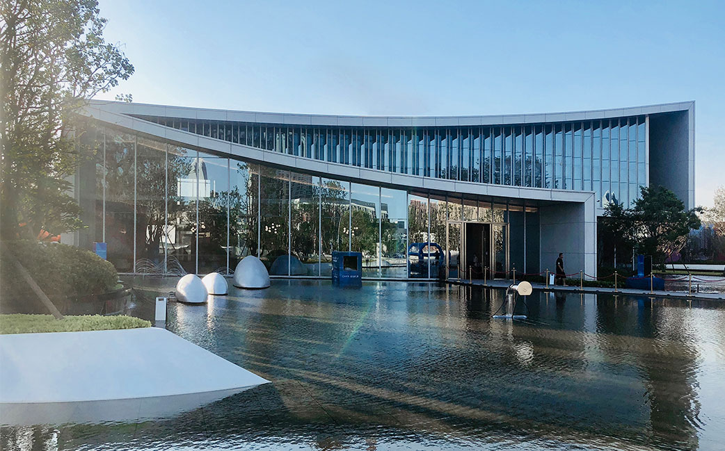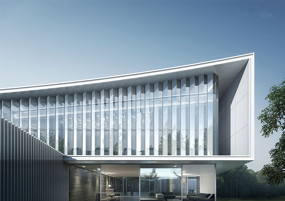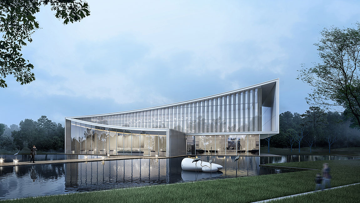 設(shè)計提煉莆田的印象與地域文化,將媽祖建筑屋頂概念置入設(shè)計之中。以現(xiàn)代挺拔的幾何線條,勾勒出靈動的弧形屋面,形成高低錯落的形體節(jié)奏。通過豎向玻璃幕墻的有序結(jié)拼疊,達(dá)到輕巧簡潔、虛實(shí)有致的審美體驗(yàn)的同時,也引入了莆田水景流動的韻律感。大面積的玻璃幕墻通透如玉,與水中倒映虛實(shí)交錯互為對景,再由天光云影充當(dāng)背景,營造出“清風(fēng)徐來,水波不興”的生態(tài)美感和恬淡心境。