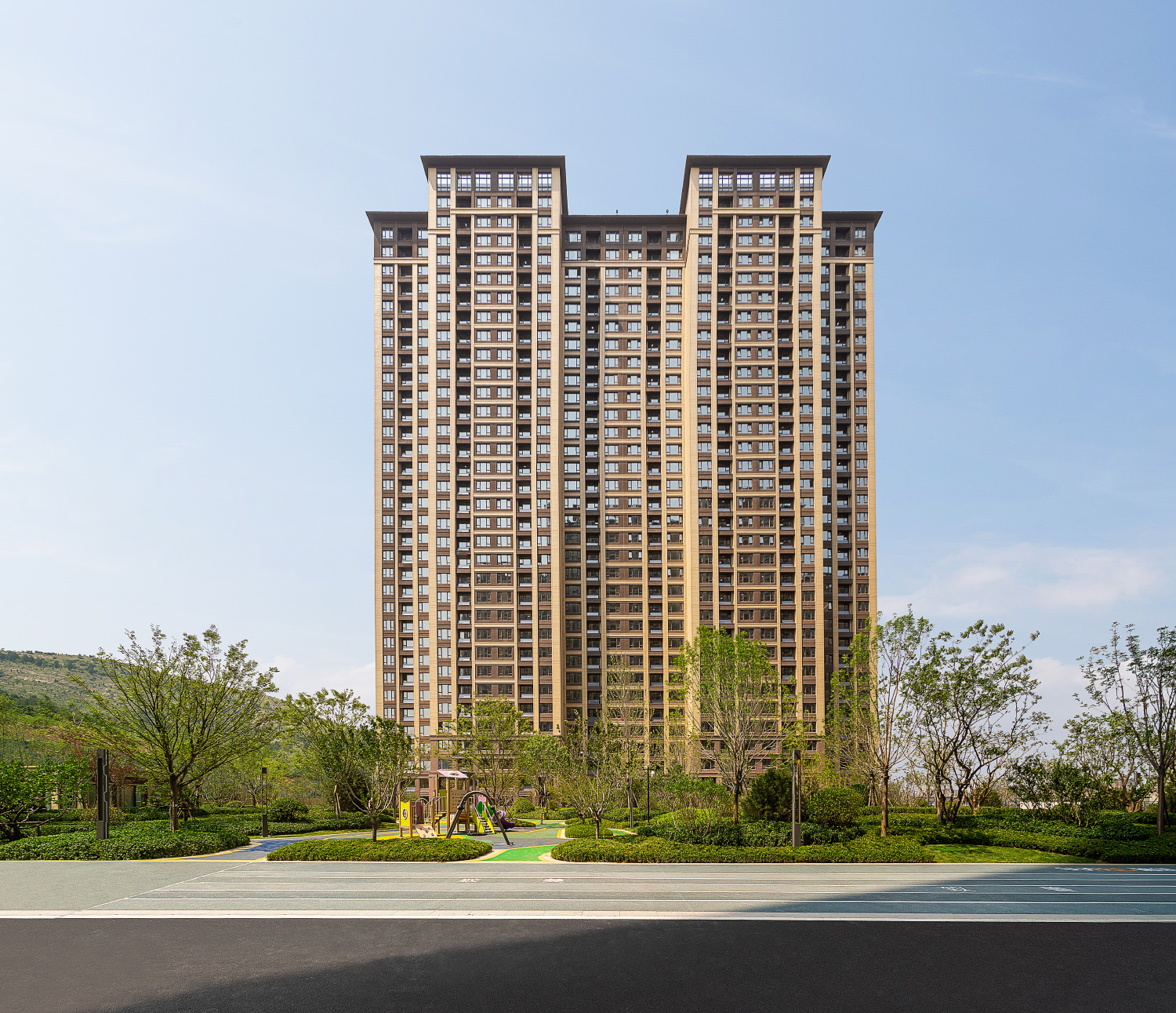 項目位于濟南城市東進主軸線上,濟南向東發(fā)展咽喉地帶,毗鄰蓮花山,周邊的人文自然景觀無不是天然理想的棲居之所。在這里只有簡約又不失內(nèi)蘊的現(xiàn)代理性建筑風格才能盡顯都市生活的豪華與貼近自然的爛漫情調(diào),提供人文居住的絕佳意境。項目采用改良的現(xiàn)代理性風格建筑形式,吸收先進建筑基調(diào)的精華,通過典雅大氣的建筑形式和莊重氣質(zhì)的景觀設計營造出自身特有的氣質(zhì)內(nèi)涵,在彰顯自身個性的同時,以一種優(yōu)雅的姿態(tài)融入簡約、典雅、親近自然的總體氛圍中。建筑成組團布置,錯落有致,每一戶都能享受園林社區(qū)的優(yōu)美庭院景觀。建筑高度跟隨臺地高差起伏變化,形成豐富的城市界面。景觀設計與建筑設計相協(xié)調(diào),通過多層級大小庭院串聯(lián)等景觀手法,體現(xiàn)項目大氣、優(yōu)雅的氣質(zhì)。