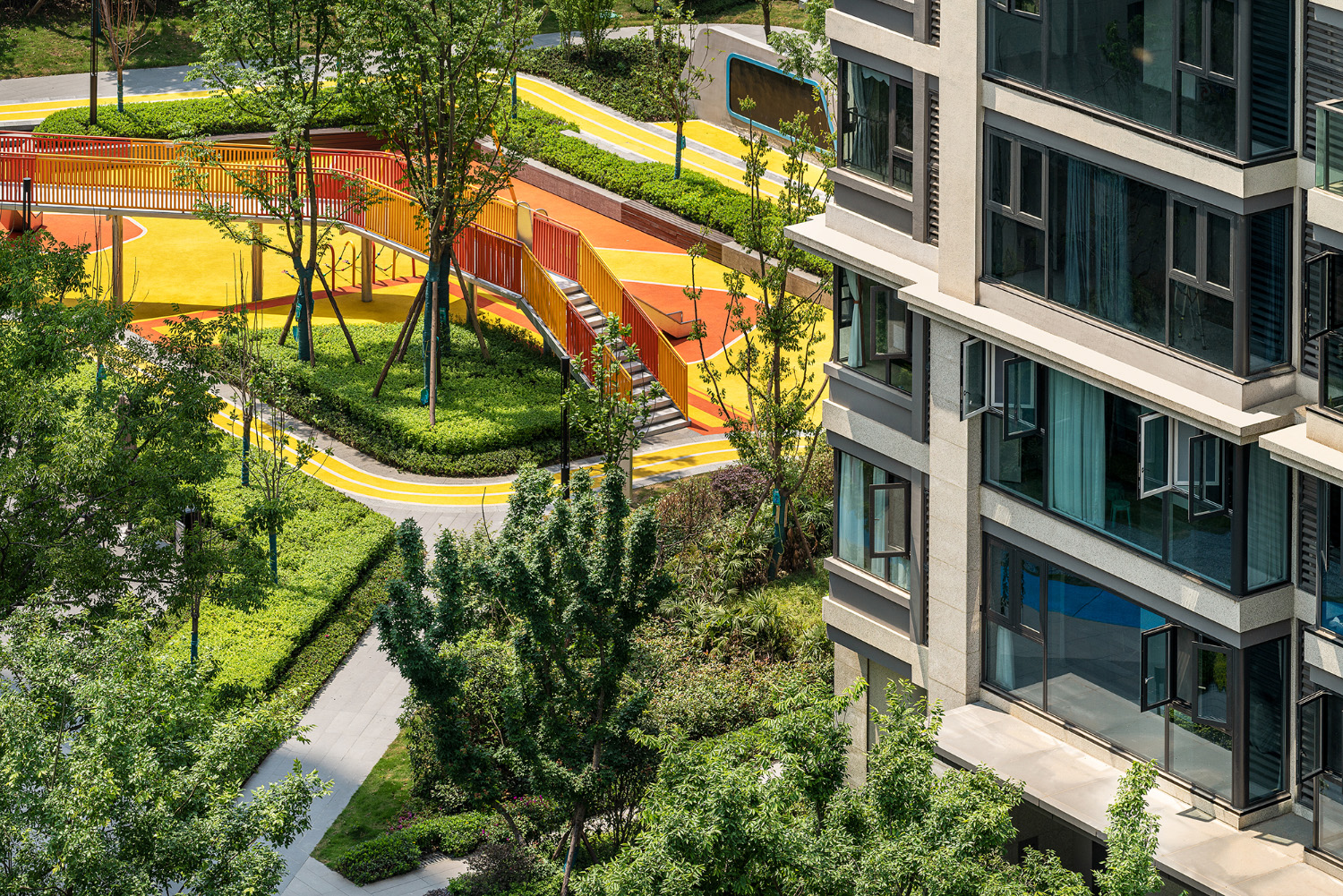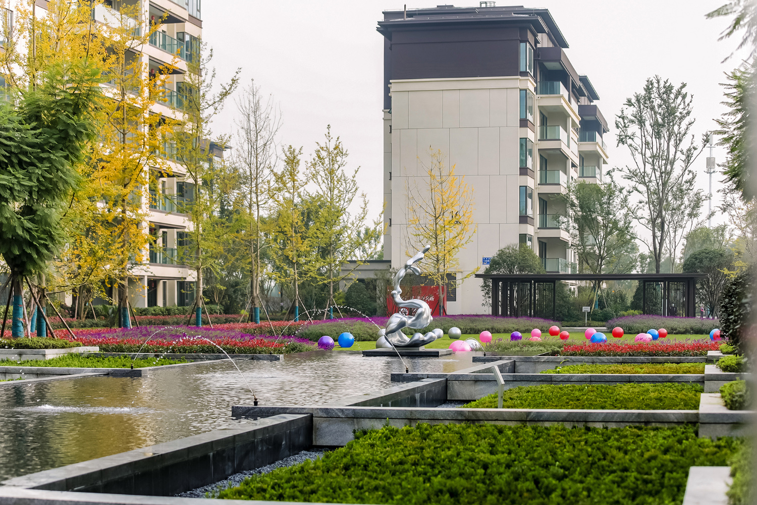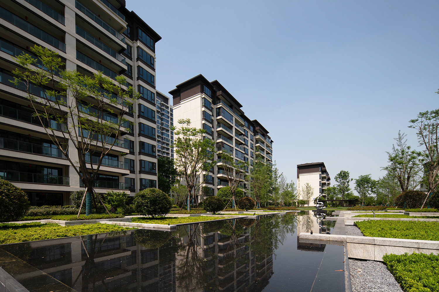 中國人自古崇尚自然,將心靈寄托于自然,在天地之間尋求超越自我的精神境界。梧桐集位于毗河綠化帶與錦城綠道之間的絕佳地理位置,為居民們提供了親近自然的契機。設計在住宅內(nèi)規(guī)劃一條12米寬,連接南北主要城市道路的車行道,將小區(qū)分為東西兩部分,高層住宅沿南北兩側城市主干道布置,主要集中在西側和東北側,多層住宅沿河岸綠化帶布置,集中在東側,項目整體形成由靠近毗河綠化帶一側,向西逐漸升高的建筑形態(tài),為居民提供了開闊的河岸景觀自然環(huán)境。同時,住宅內(nèi)布置的景觀軸串聯(lián)整個社區(qū),為每個庭院打造美麗和諧的主題景觀。
