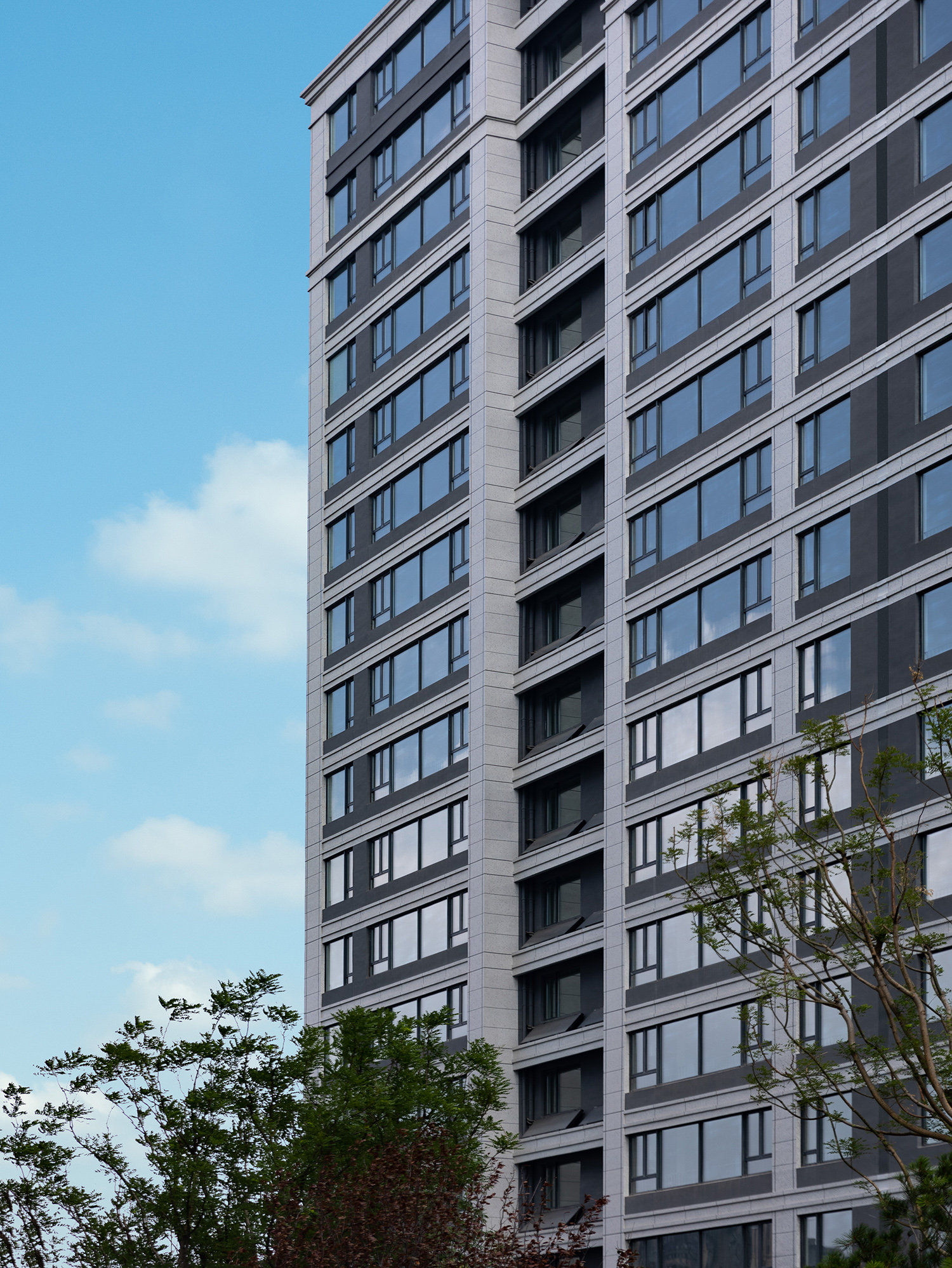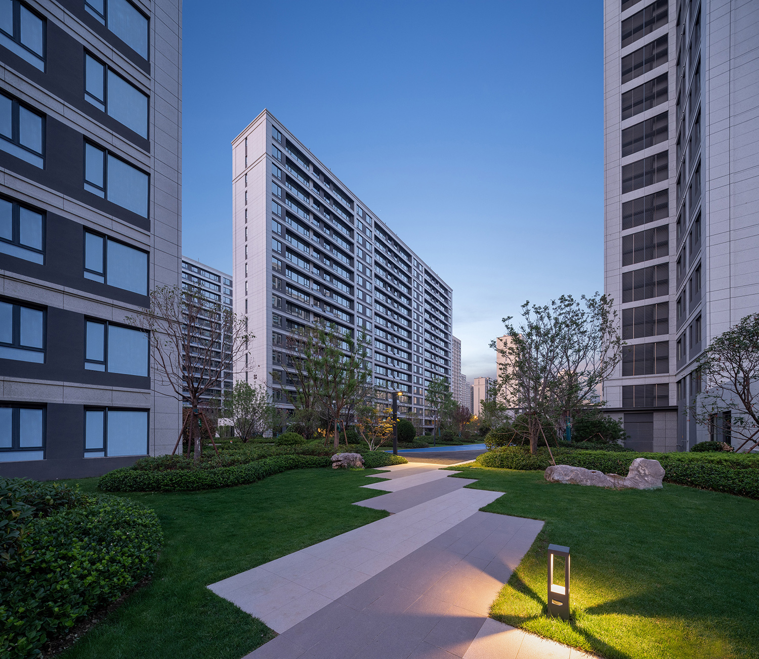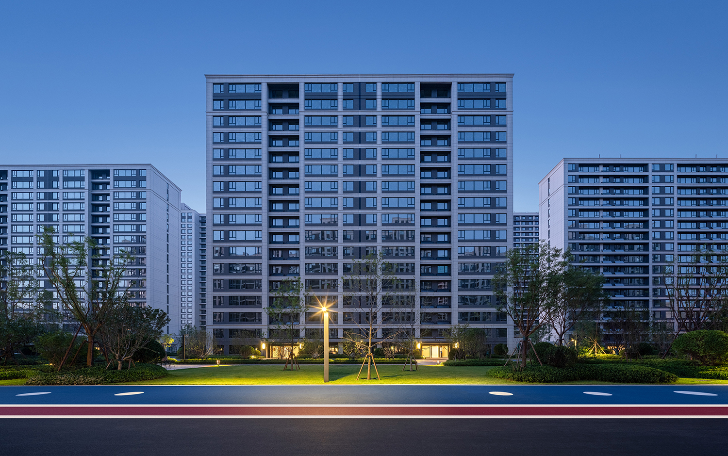 項(xiàng)目珍珠藍(lán)色調(diào)的大面積玻璃,映襯著天空和自然,提升了建筑的整體通透度,連續(xù)的陽(yáng)臺(tái)設(shè)計(jì)使得建筑立面平整,給每家每戶帶來(lái)充足的陽(yáng)光和開闊的視野。建筑群在陽(yáng)光的映照下散發(fā)精致、莊重的氣息。