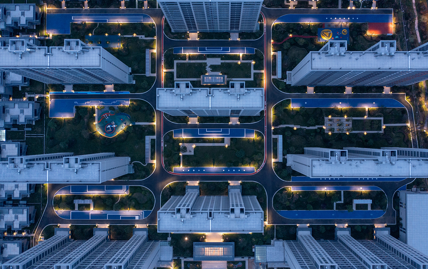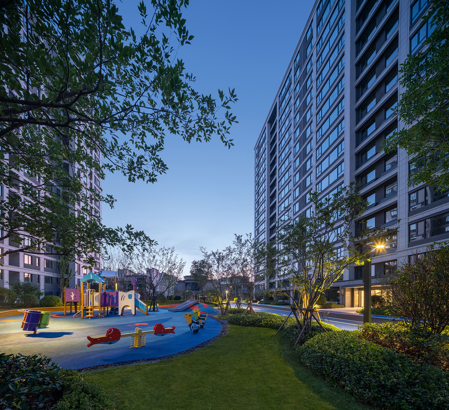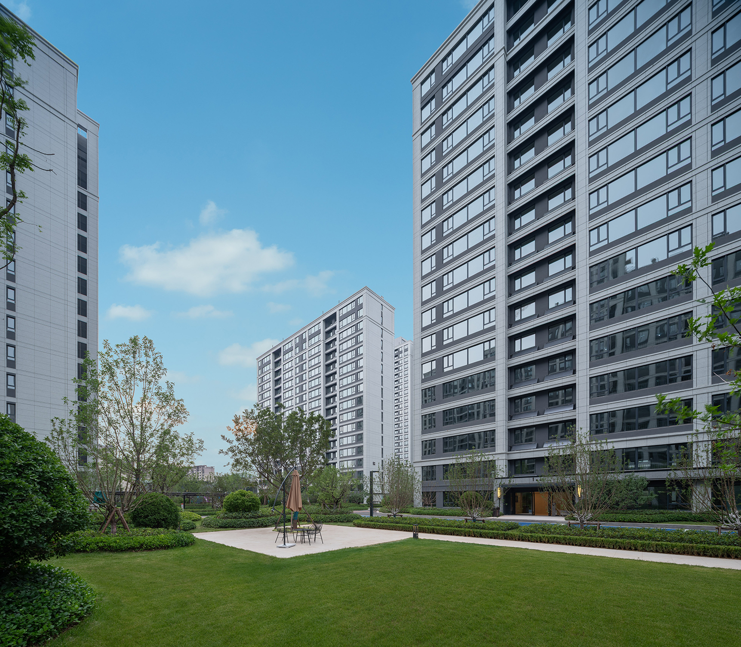 項(xiàng)目珍珠藍(lán)色調(diào)的大面積玻璃,映襯著天空和自然,提升了建筑的整體通透度,連續(xù)的陽(yáng)臺(tái)設(shè)計(jì)使得建筑立面平整,給每家每戶帶來(lái)充足的陽(yáng)光和開闊的視野。建筑群在陽(yáng)光的映照下散發(fā)精致、莊重的氣息。