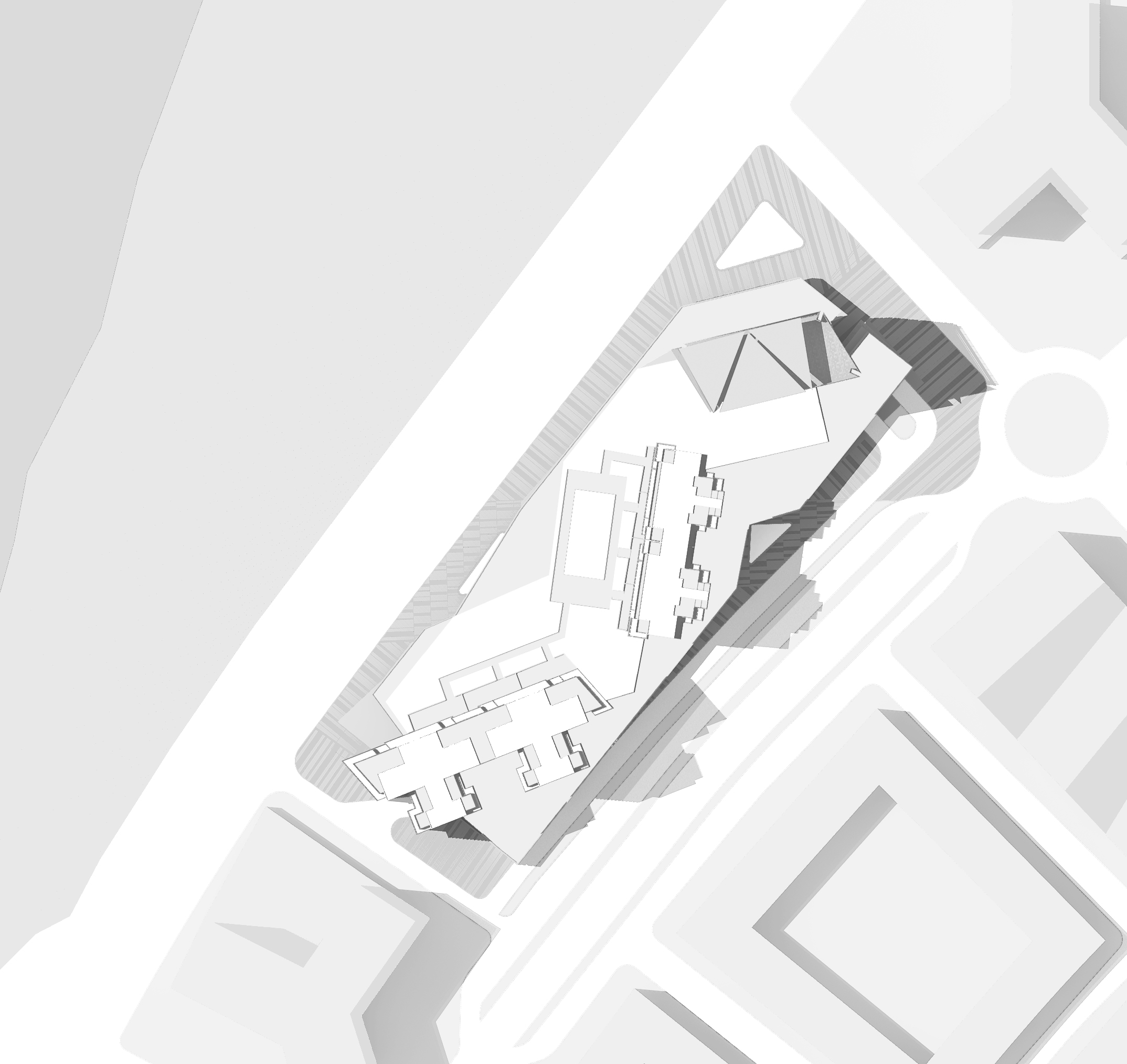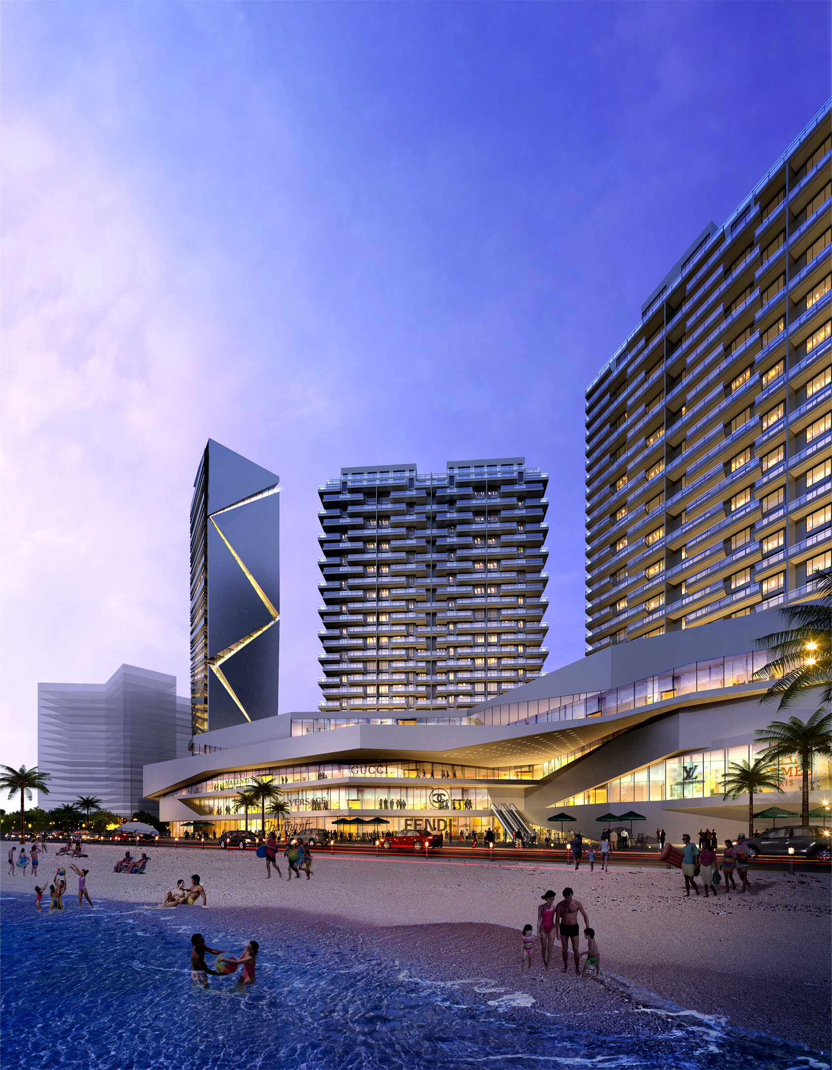 項(xiàng)目用地在安哥拉首都羅安達(dá)濱海港灣,緊鄰總統(tǒng)府,建筑層數(shù)受到限制,回填人造海灣地下室最多可下挖一層,而高端的濱海住宅和辦公及商業(yè)又有較高的車位配比率,占地面積較小,如何解決方案中的車行流線及停車問題是設(shè)計(jì)中的一個(gè)難點(diǎn)。每棟建筑的體量旋轉(zhuǎn),使得景觀視野最大化,并充分保護(hù)隱私,頂部躍層的退臺(tái)形成屋頂?shù)目罩谢▓@。辦公與會(huì)所頂部設(shè)有屋頂花園、游泳池等共享設(shè)施,與周邊底層住宅形成鮮明對(duì)比。商業(yè)的三層設(shè)置了帶有夾層的立體停車庫,立面上采用立體綠化,使得建筑變得可以呼吸,綠色生態(tài)在環(huán)境塑造上形成共生。合理利用現(xiàn)有的道路規(guī)劃,打造商業(yè)中心,并將商業(yè)氛圍延伸至全新打造的濱海景觀帶,創(chuàng)造更加豐富的濱海休閑商業(yè)??臻g體驗(yàn)活潑并且富有節(jié)奏感,整個(gè)立體形式都有條不紊。簡約的空間設(shè)計(jì)力求含蓄,達(dá)到以少勝多,以簡勝繁的效果。
