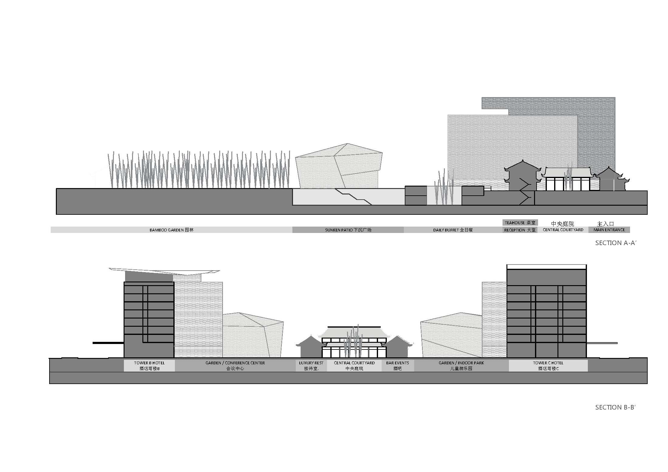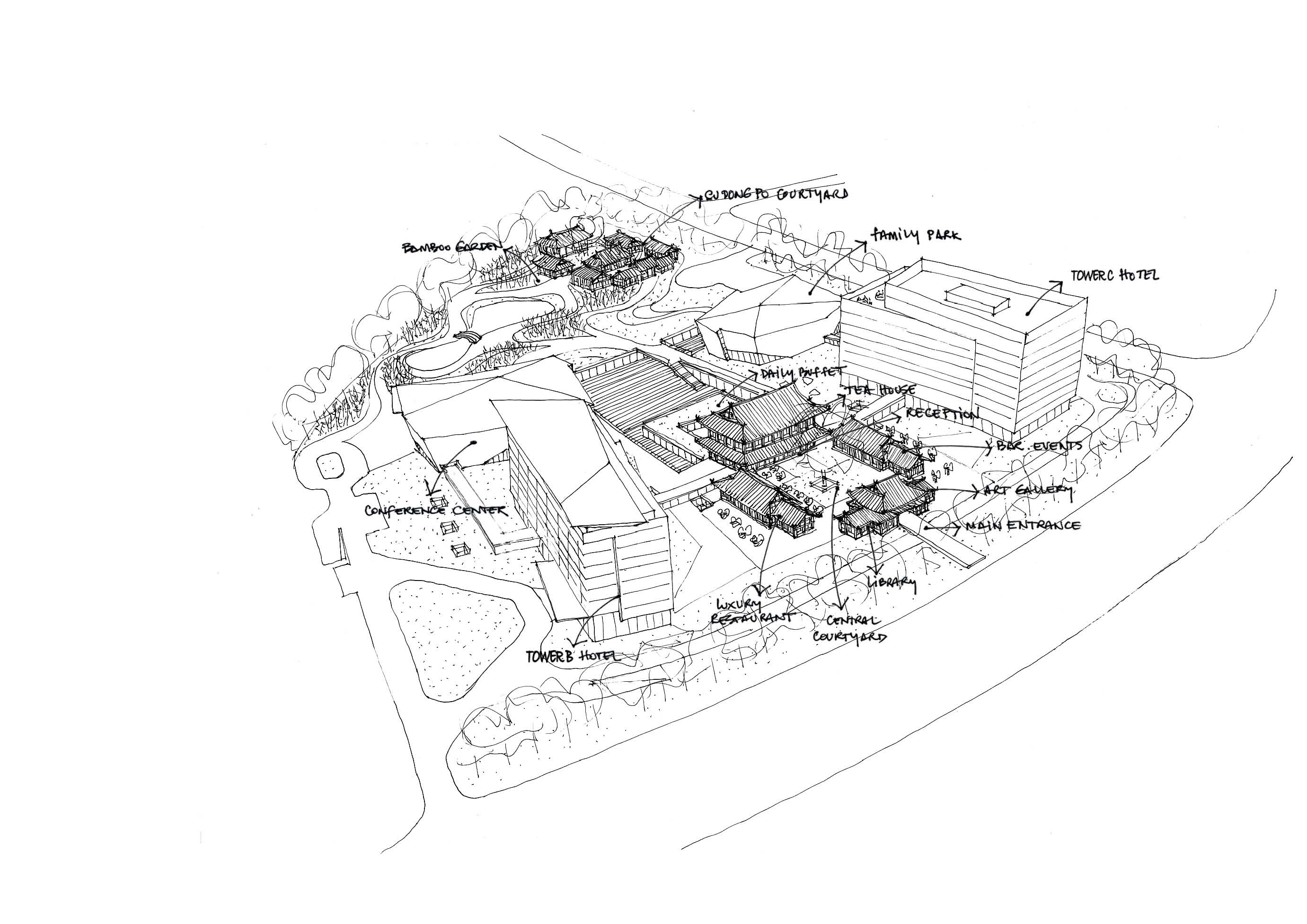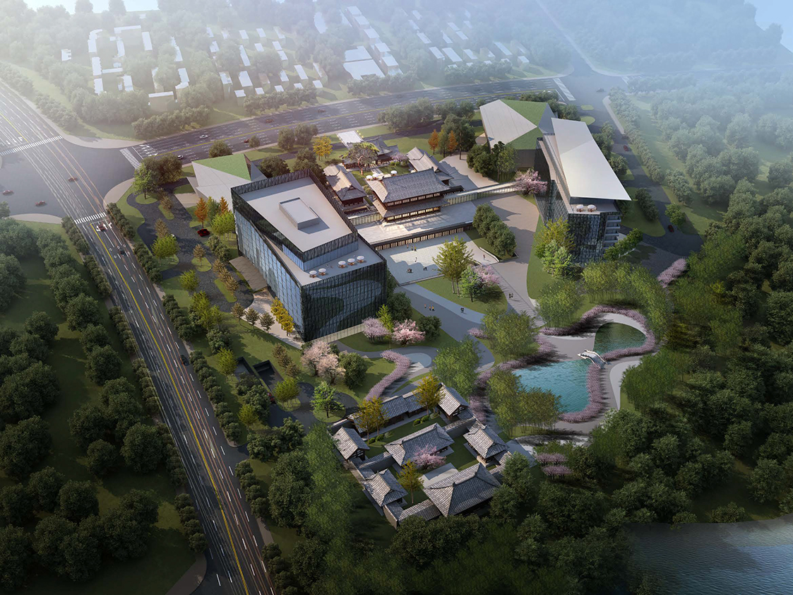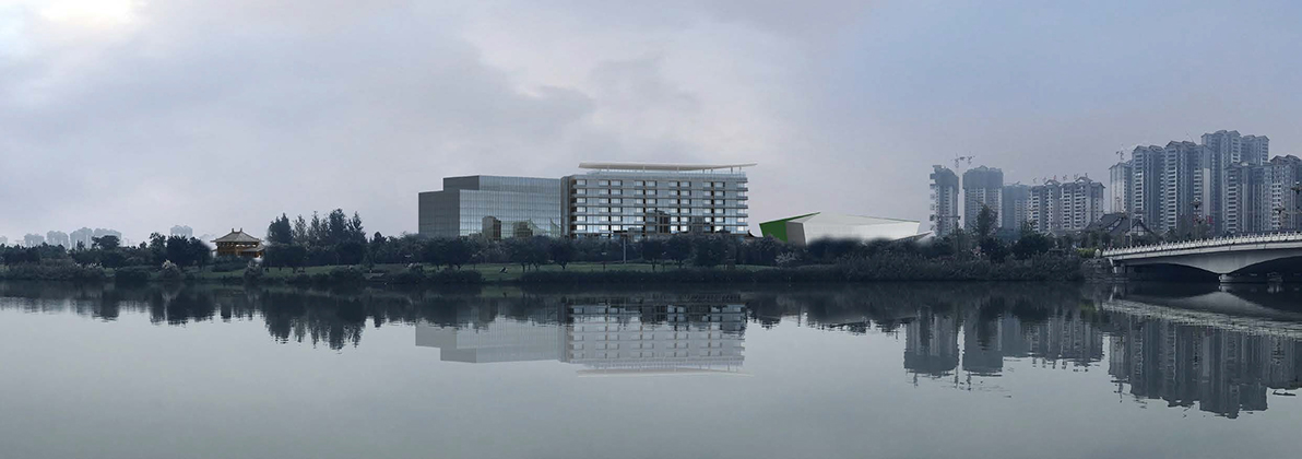 項(xiàng)目距離三蘇祠西側(cè)2.8公里,位于市區(qū)東面的東坡島湖岸區(qū),與眉山著名的遠(yuǎn)景樓隔湖相望,僅相距600米,北臨濕地公園,景觀資源優(yōu)越。酒店采用圍合庭院式布局,酒店大堂、全日餐廳等公共服務(wù)區(qū)設(shè)置在具有傳統(tǒng)中式建筑風(fēng)格的中央院落內(nèi)。兩側(cè)分別為極具現(xiàn)代風(fēng)格的獨(dú)立服務(wù)空間,包括會(huì)議中心和親子樂園。穿過中央院落即可到達(dá)酒店內(nèi)部的大庭院,北側(cè)是對(duì)景的竹林和東坡橋。庭院兩側(cè)分別為一棟8層的客房樓,共設(shè)有150至200間客房。在用地的最北側(cè),設(shè)計(jì)了一座東坡書院,供閱讀、品茶、書畫欣賞,以感悟東坡精神,營造一個(gè)氛圍優(yōu)雅的場所。