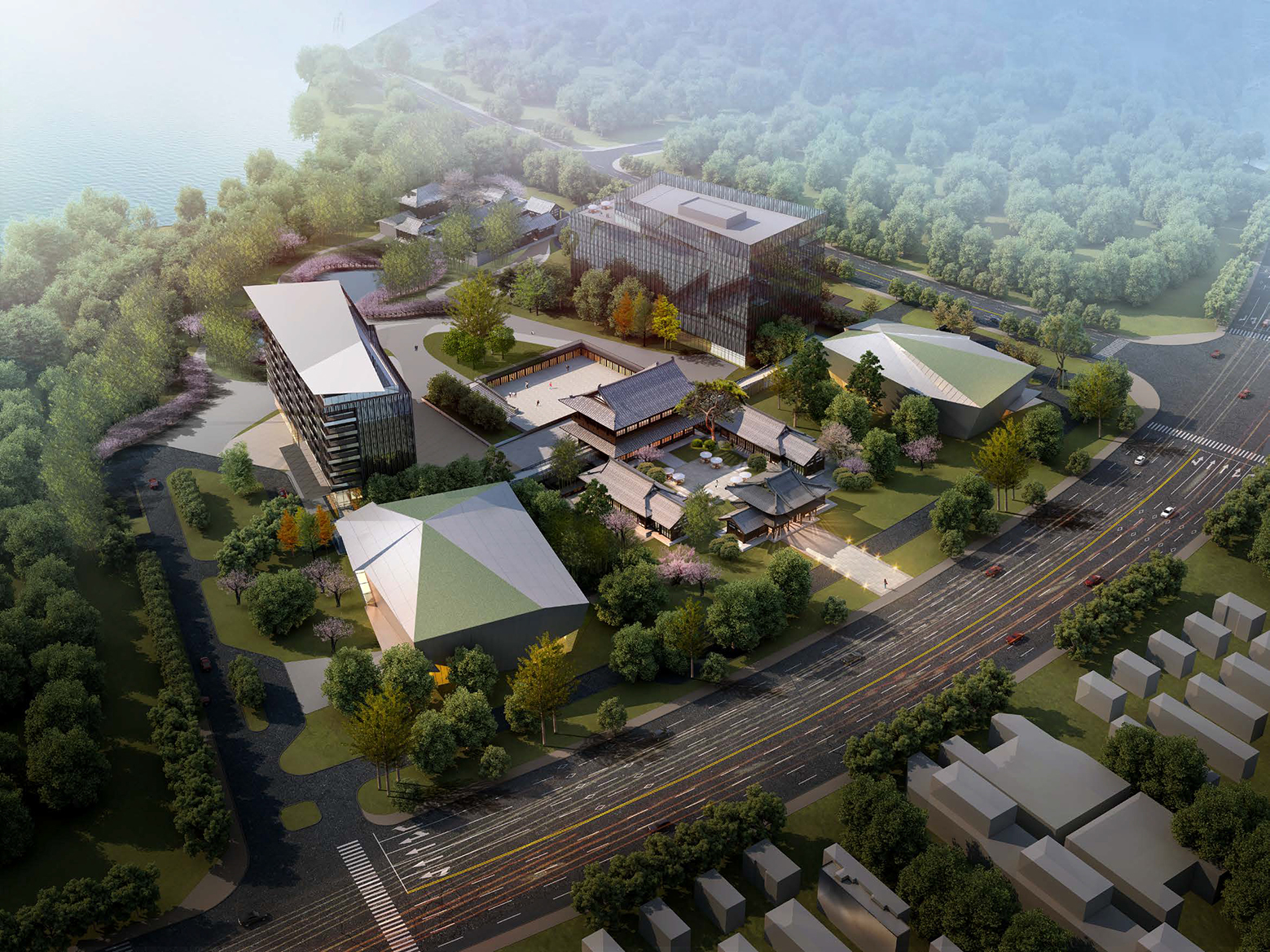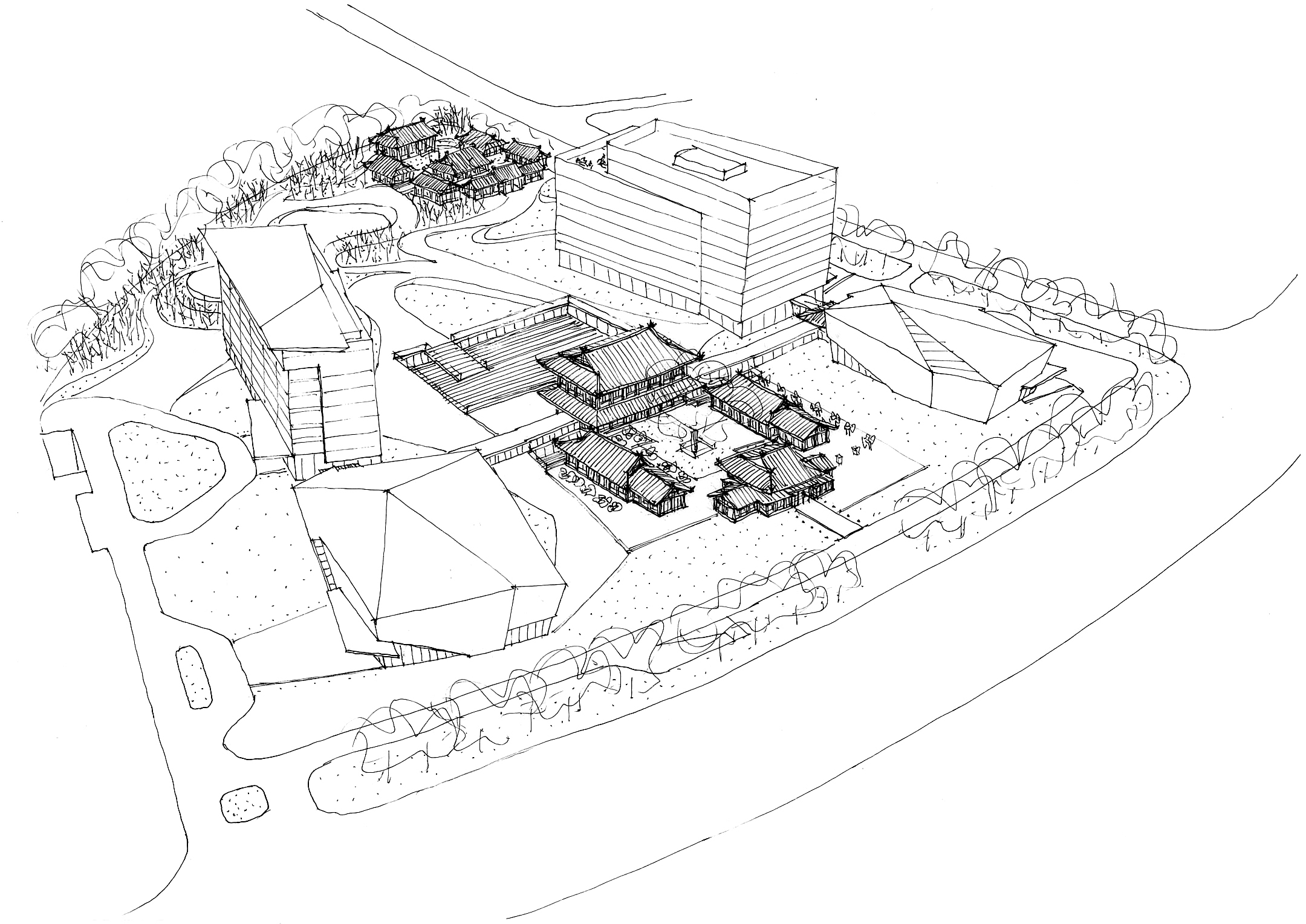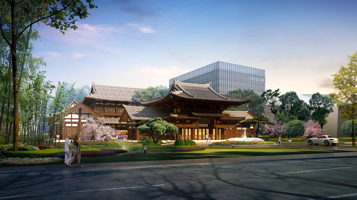 項(xiàng)目距離三蘇祠西側(cè)2.8公里,位于市區(qū)東面的東坡島湖岸區(qū),與眉山著名的遠(yuǎn)景樓隔湖相望,僅相距600米,北臨濕地公園,景觀資源優(yōu)越。酒店采用圍合庭院式布局,酒店大堂、全日餐廳等公共服務(wù)區(qū)設(shè)置在具有傳統(tǒng)中式建筑風(fēng)格的中央院落內(nèi)。兩側(cè)分別為極具現(xiàn)代風(fēng)格的獨(dú)立服務(wù)空間,包括會(huì)議中心和親子樂園。穿過中央院落即可到達(dá)酒店內(nèi)部的大庭院,北側(cè)是對(duì)景的竹林和東坡橋。庭院兩側(cè)分別為一棟8層的客房樓,共設(shè)有150至200間客房。在用地的最北側(cè),設(shè)計(jì)了一座東坡書院,供閱讀、品茶、書畫欣賞,以感悟東坡精神,營造一個(gè)氛圍優(yōu)雅的場所。