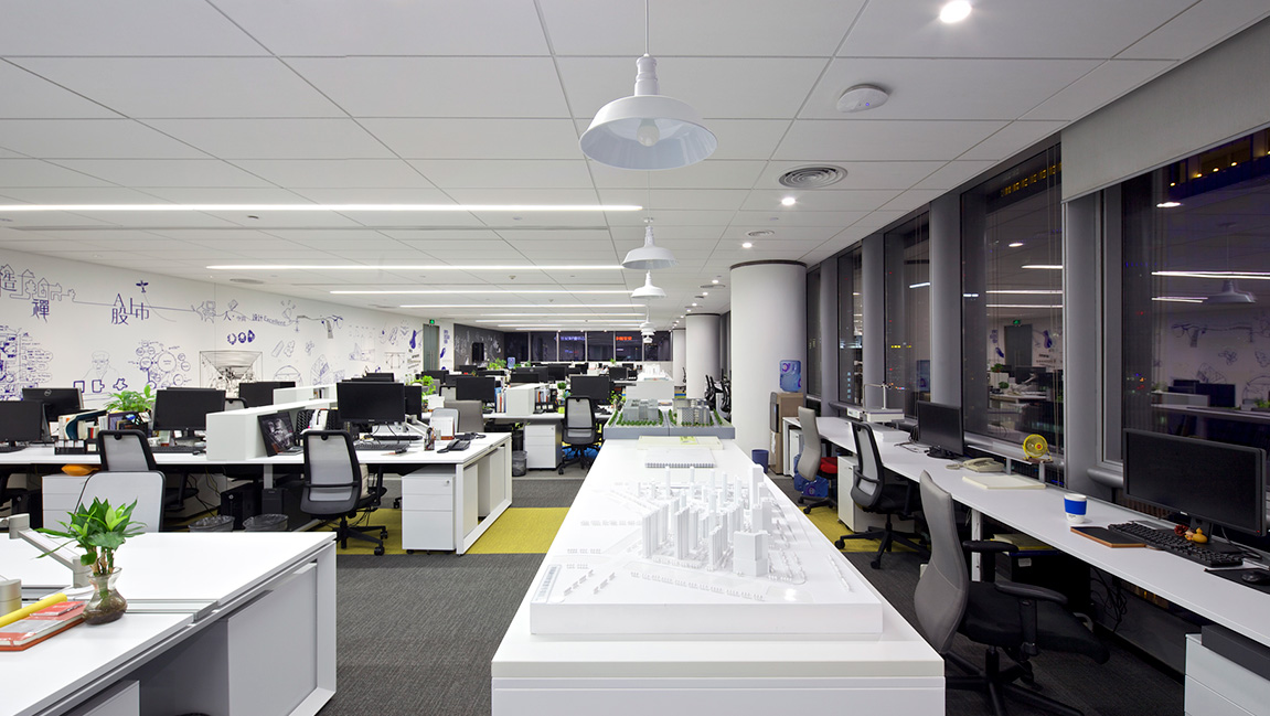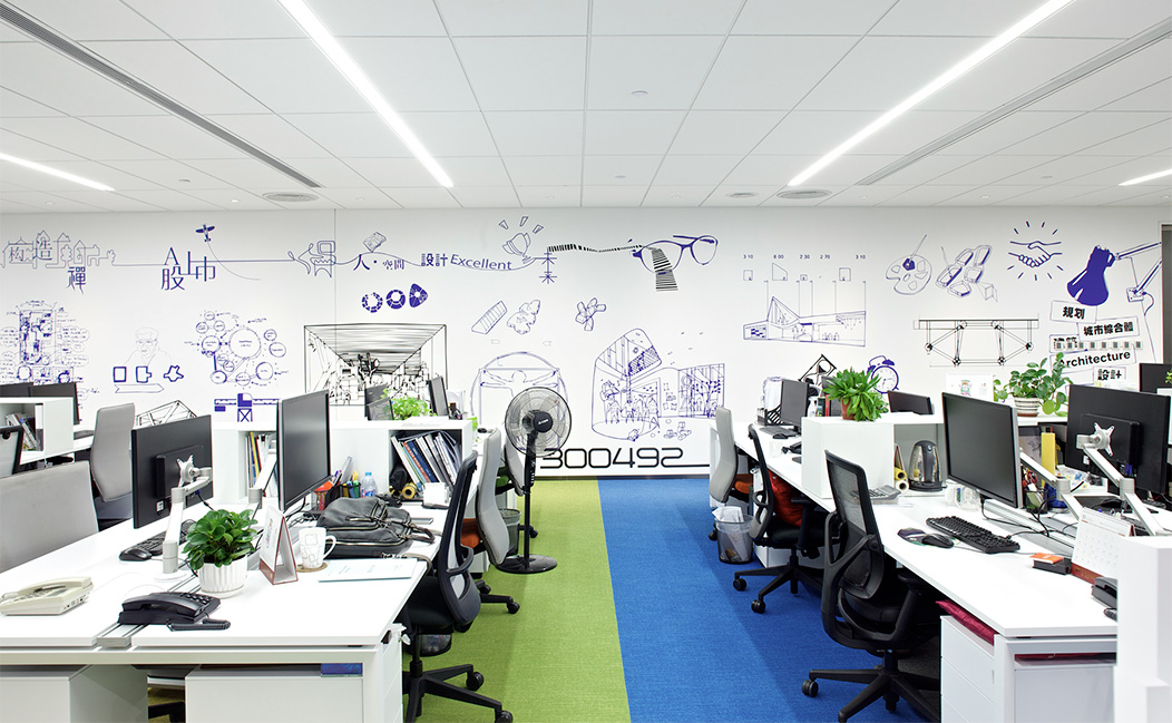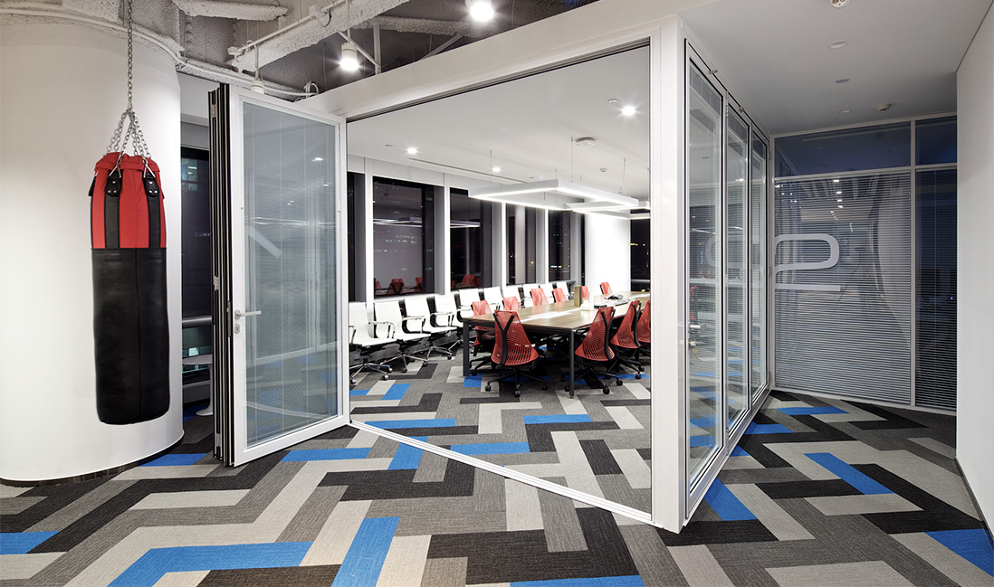 項目的辦公家具全部采用全球第一大辦公家具品牌Steelsace提供,地毯為全球第一大塊毯SHAW提供, 另外還使用了德國旭格的推拉門、英國索恩THORN的燈具、星牌優(yōu)時吉的礦棉板等,力求打造高效、靈活、科技、環(huán)保的辦公空間。墻面采用絲網(wǎng)印刷技術(shù), 設(shè)置拳擊沙袋區(qū),這些既體現(xiàn)了企業(yè)文化,同時也達到辦公環(huán)境與家具、地毯的渾然天成,增強了員工工作中的愉悅度。
