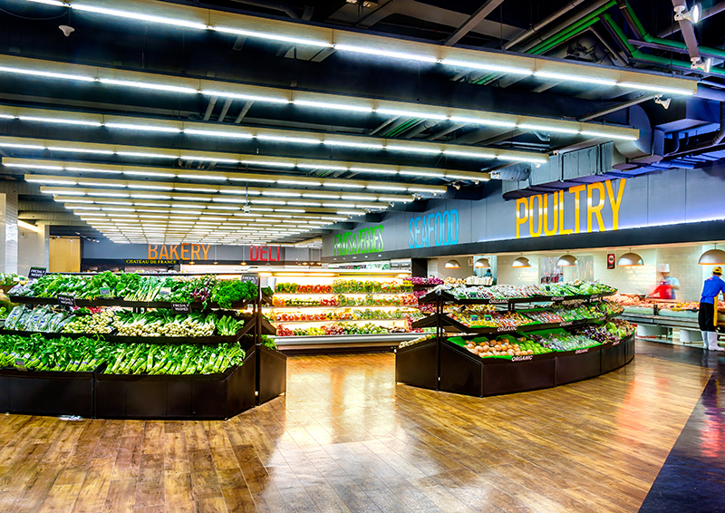 靈感來自于北美的城市美食超市 , 我們創(chuàng)建了一個食品雜貨店的經(jīng)驗 , 基于真實的客戶基礎(chǔ)溝通了國際化的品味和生活方式。不同于這個國家其他典型的超市,這個位于 SM Aura 商場內(nèi)的 9,300 平方米的超市被分成不同的“世界”,每個類別有不同的設(shè)施,并且依照它所售賣的商品來設(shè)計。雖然超市由不同的子環(huán)境組成,整個商店室內(nèi)設(shè)計遵循一個有凝聚力的概念聯(lián)系在一起。設(shè)計的顏色和材質(zhì)打造出新鮮的概念,灰色的地板 , 天花板和墻面組成一個酷炫的背景使貨品凸出。木飾面墻壁和展示設(shè)施及照明提供一個新鮮和自然的背景,尤其是針對新鮮農(nóng)產(chǎn)品。部分墻面采用白色的瓷磚提供一個干凈、精致的背景,新鮮、生動的綠色用于關(guān)鍵位置,提供一個涼爽 , 自然的室內(nèi)風(fēng)格。