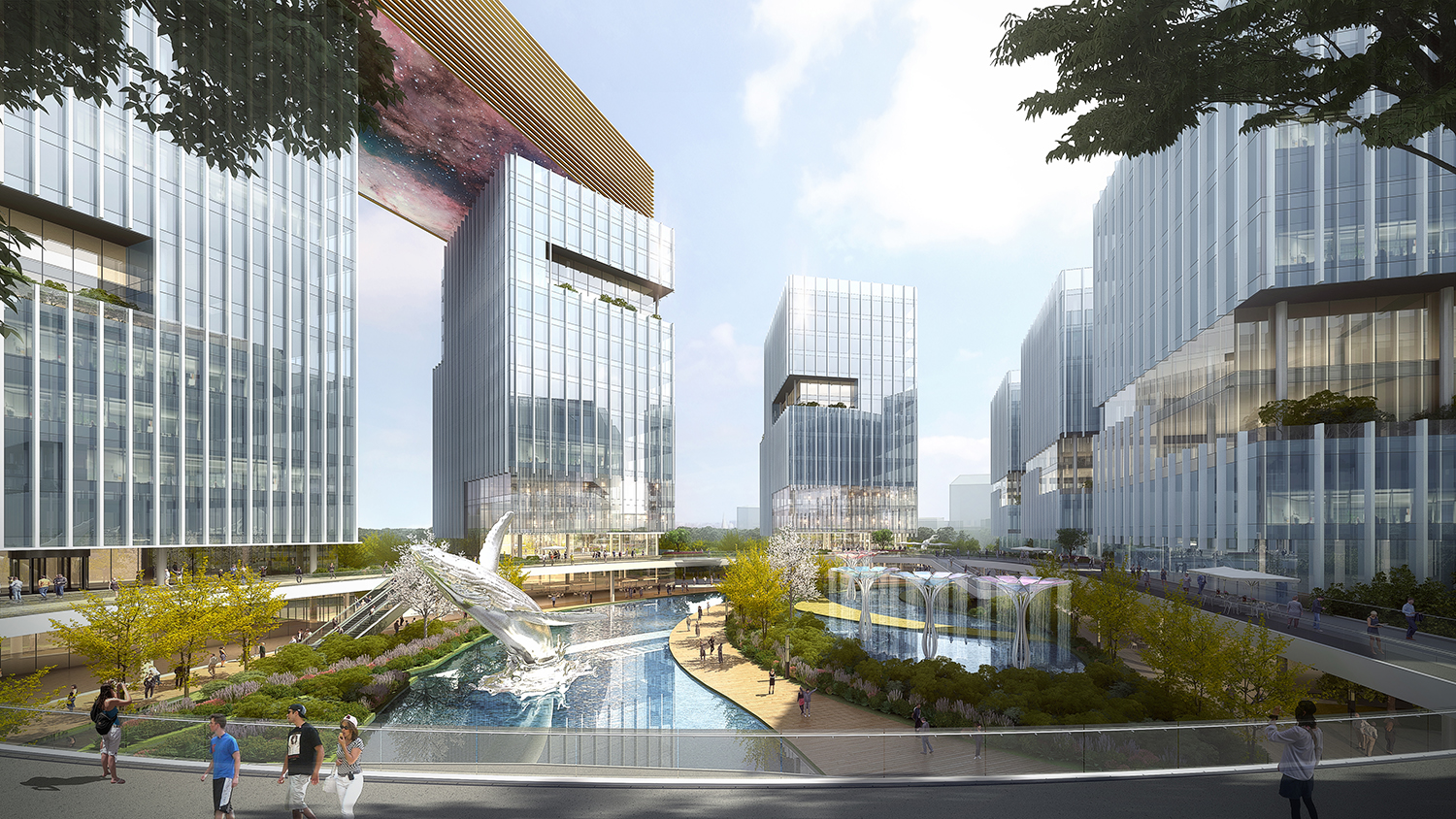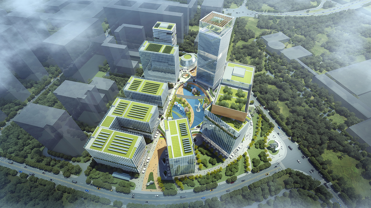 項目位于廣東省深圳市龍華區(qū)。項目西側(cè)有觀瀾河濕地公園、大浪市民公園,北邊是中心公園,東側(cè)是平湖生態(tài)濕地公園,景觀資源豐富。園區(qū)周邊緊鄰好日子卷煙廠、富安娜龍華工業(yè)園、龍華傳媒科技產(chǎn)業(yè)園、寶能科技園、清湖科技園等國內(nèi)外知名大型企業(yè)集團等,區(qū)域整體產(chǎn)業(yè)氛圍良好。項目規(guī)劃采用“一軸一帶一心”布局形式,南北主景觀軸打通園區(qū)內(nèi)部與基地周邊的聯(lián)系,東西次要景觀帶連接一期已建區(qū)域,使得一、二期形成有機統(tǒng)一的整體。中心大花園使整個園區(qū)具有強烈的內(nèi)聚性,為園區(qū)辦公人員提供休閑娛樂的場地。項目意在打造深圳龍華區(qū)創(chuàng)新街區(qū)標(biāo)桿,為知識型員工間的創(chuàng)業(yè)和思想交流,提供豐富多元的街區(qū)化城市生活。