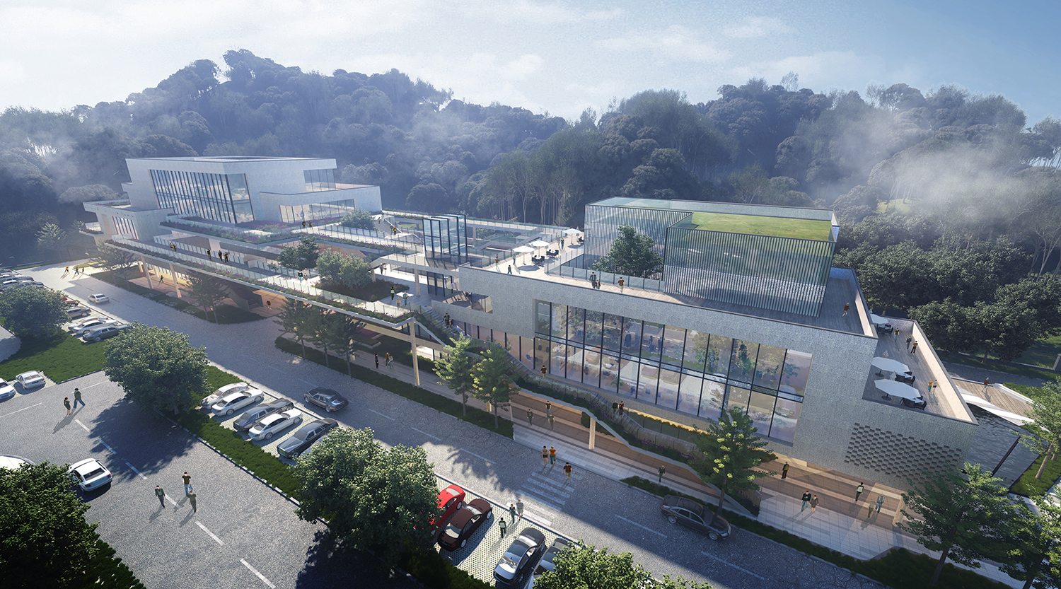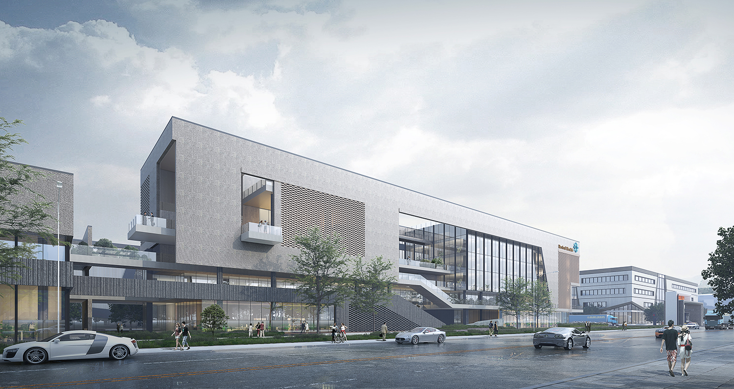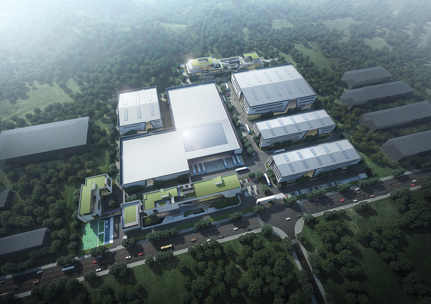 項(xiàng)目位于江西宜春市袁州區(qū),園區(qū)建筑包括多層綜合樓、研發(fā)生產(chǎn)樓、宿舍、廠房等。園區(qū)內(nèi)建筑采用現(xiàn)代風(fēng)格元素塑造高端企業(yè)的整體形象,辦公樓建筑立面采用石材加玻璃幕墻整體設(shè)計(jì)。研發(fā)樓層層退臺(tái),與南面枯山形成體塊呼應(yīng)關(guān)系。廠房立面根據(jù)線條上下波動(dòng),形成有韻律建筑氛圍。廠房的采光設(shè)計(jì)采取一層大面積玻璃幕墻及屋頂開窗的采光方式,使得較大體量的廠房采光得以解決。