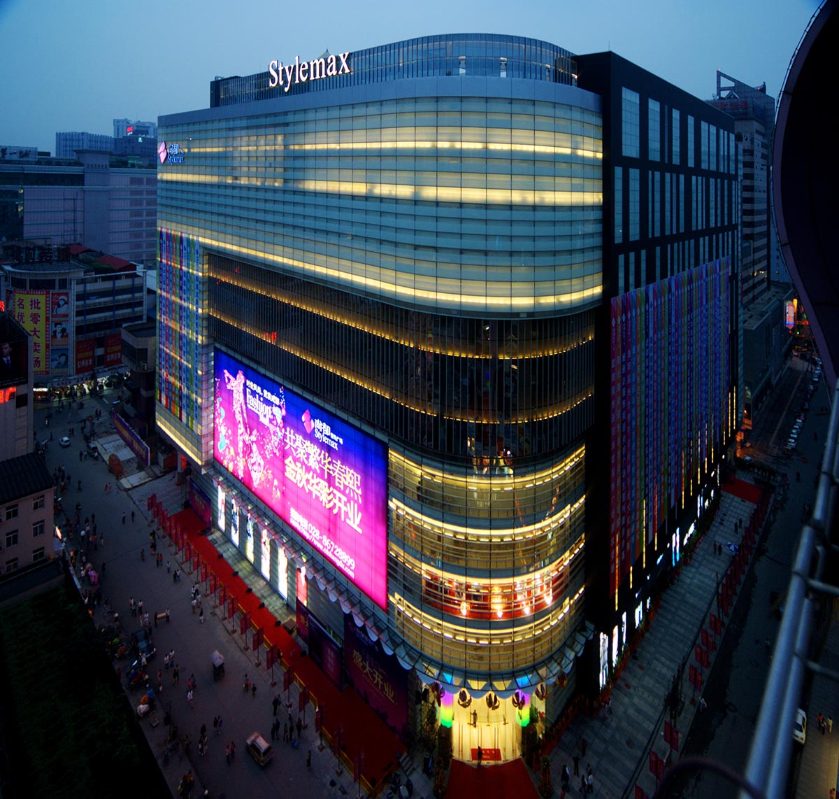 為了能使建筑物在眼花繚亂的周邊商業(yè)環(huán)境中脫穎而出,建筑立面采用了整體性強(qiáng)、現(xiàn)代時(shí)尚的設(shè)計(jì)手法,以簡潔的線、面為主,追求純凈明快的現(xiàn)代建筑形式,著重展現(xiàn)商業(yè)建筑的品質(zhì)和氣氛。特別是在建筑立面的玻璃幕墻的細(xì)部設(shè)計(jì)方面,進(jìn)行了大塊面且不乏細(xì)部的刻畫。 因?yàn)榻ㄖ娣e的要求使得立面上不能有大的進(jìn)退體量關(guān)系,設(shè)計(jì)上通過對透明、鏡面、磨砂和背漆四種不同的玻璃處理來達(dá)到立體感的效果。同時(shí)結(jié)合燈光設(shè)計(jì),使立面的立體效果在晚上也能充分地體現(xiàn)出來。