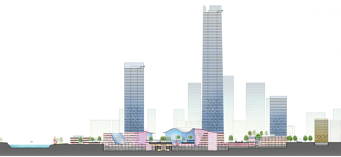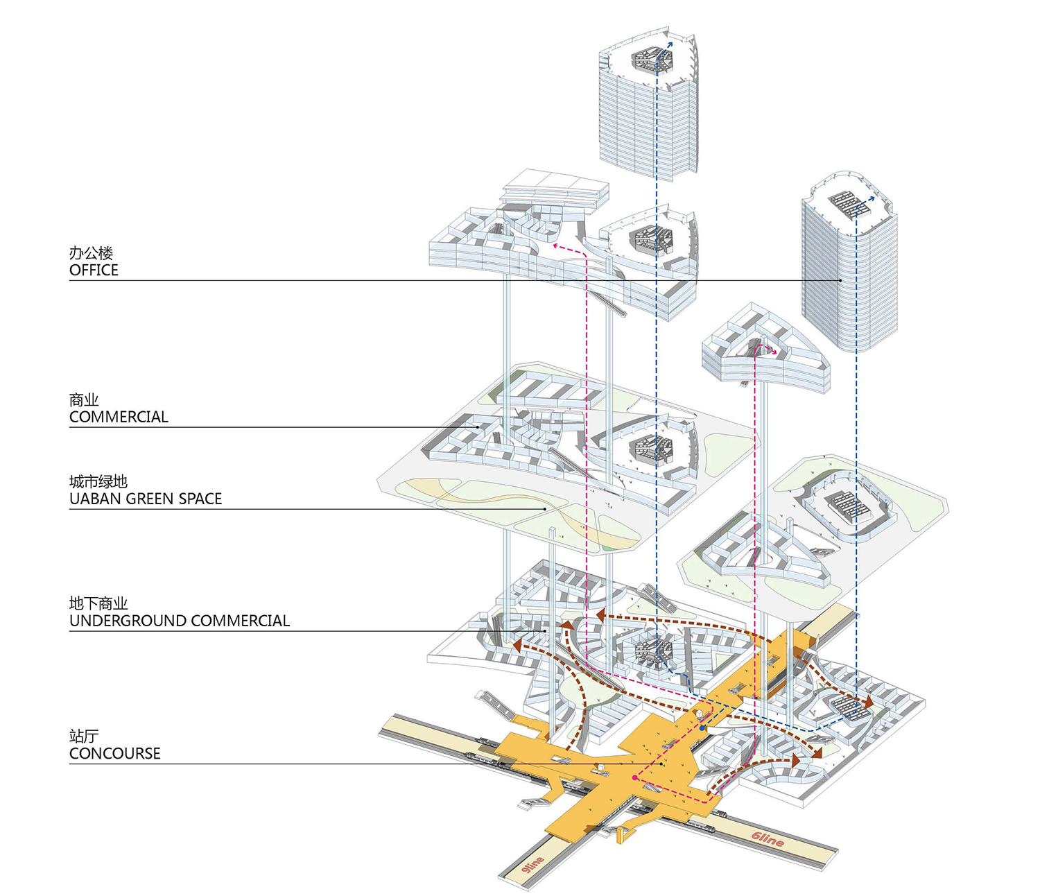 項(xiàng)目位于中央商務(wù)區(qū)核心地塊,著力打造以地鐵6號(hào)線及9號(hào)線交通優(yōu)勢(shì)為導(dǎo)向的中央商務(wù)區(qū),匯集了城市軌道交通、BRT、公交以及城市空中慢行系統(tǒng)等多種方式的立體交通體系。商業(yè)開發(fā)模式由原來(lái)的單一商業(yè)開發(fā)轉(zhuǎn)變?yōu)榧壍澜煌?、金融、商?wù)、辦公、居住、休閑娛樂(lè)為一體的TOD綜合開發(fā)模式。 項(xiàng)目區(qū)域內(nèi)軌道地下交通空間與各地塊相連,打破常規(guī)站廳層形象,行人可以從地鐵站廳層到達(dá)地下商業(yè),或者前往超高層辦公區(qū)域,也可通過(guò)飛天梯直達(dá)地上商業(yè)高區(qū)。地鐵站廳層設(shè)立藝術(shù)、生活及服務(wù)空間,與二層景觀廊橋結(jié)合,營(yíng)造出一個(gè)集娛樂(lè)、休閑、文化、出行為一體的城市會(huì)客廳。