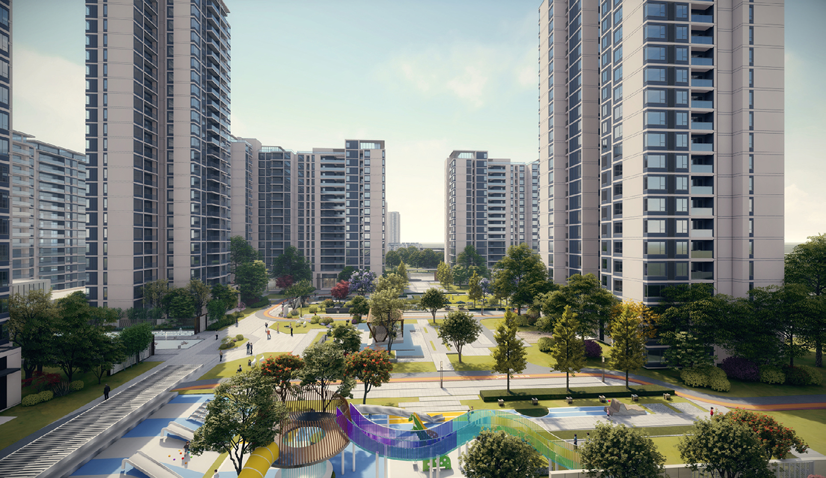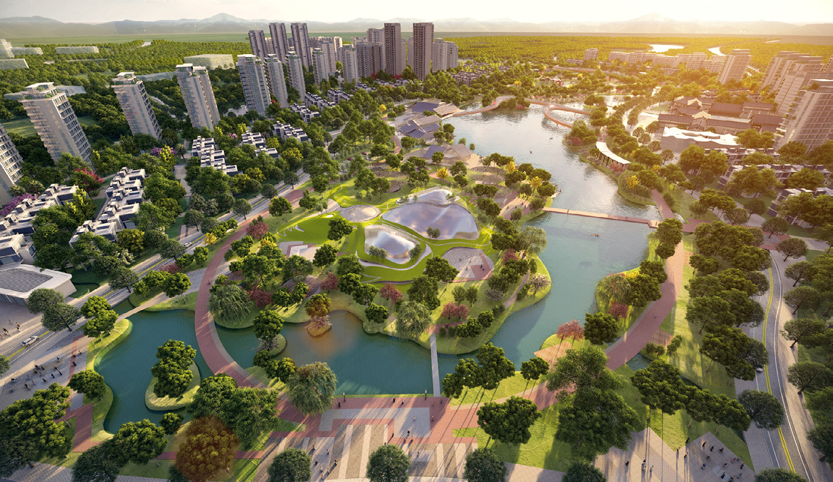 采用“織水融綠”的規(guī)劃原則,將濕地公園邊界滲透到社區(qū)內(nèi)部,讓景觀、水體穿插其間,創(chuàng)造國際化高品質(zhì)生態(tài)社區(qū),構(gòu)建一個宜人優(yōu)美的居住生態(tài)環(huán)境。用設計煥活濕地公園,融入全齡業(yè)態(tài),建設開放共享的城市公共空間。設置網(wǎng)紅打卡項目,打造一個多元生態(tài)化的微旅游目的地。