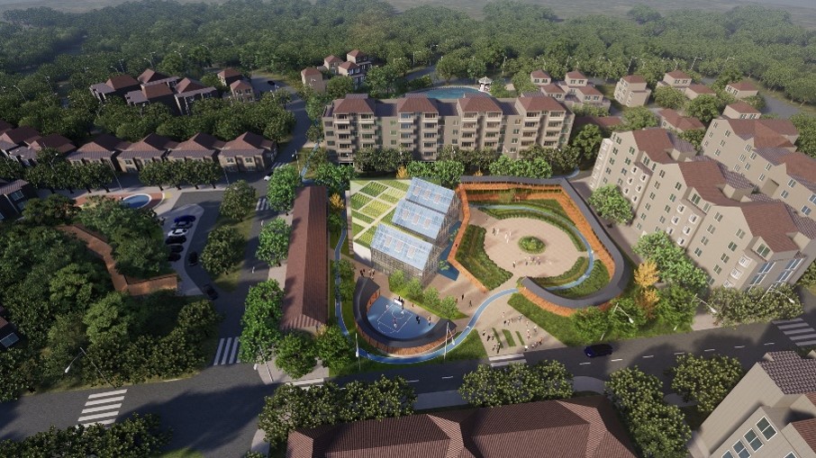 項目借鑒成都傳統(tǒng)建筑元素,打造巴渝原鄉(xiāng)生活。項目的天空綠色農(nóng)場是世界上首個低碳,液壓能推動的城市垂直農(nóng)場系統(tǒng)。針對日益加劇的城市土地、生態(tài)資源等問題,該技術(shù)旨在用盡量少的空間,能源來種植更多,更安全的食材, 該系統(tǒng)在又高又窄的A字形結(jié)構(gòu)上種植生菜、菠菜以及各種亞洲綠色蔬菜,該結(jié)構(gòu)會慢慢地轉(zhuǎn)動植物,就像在摩天輪上一樣,以確保他們得到足夠的陽光。項目為居民提供交流活動場所,全年不間斷鄰里活動的組織增強(qiáng)居民歸屬感。同時,項目注重整合周圍資源,為不同年齡的人提供活動場所,集休閑,運(yùn)動于一身。