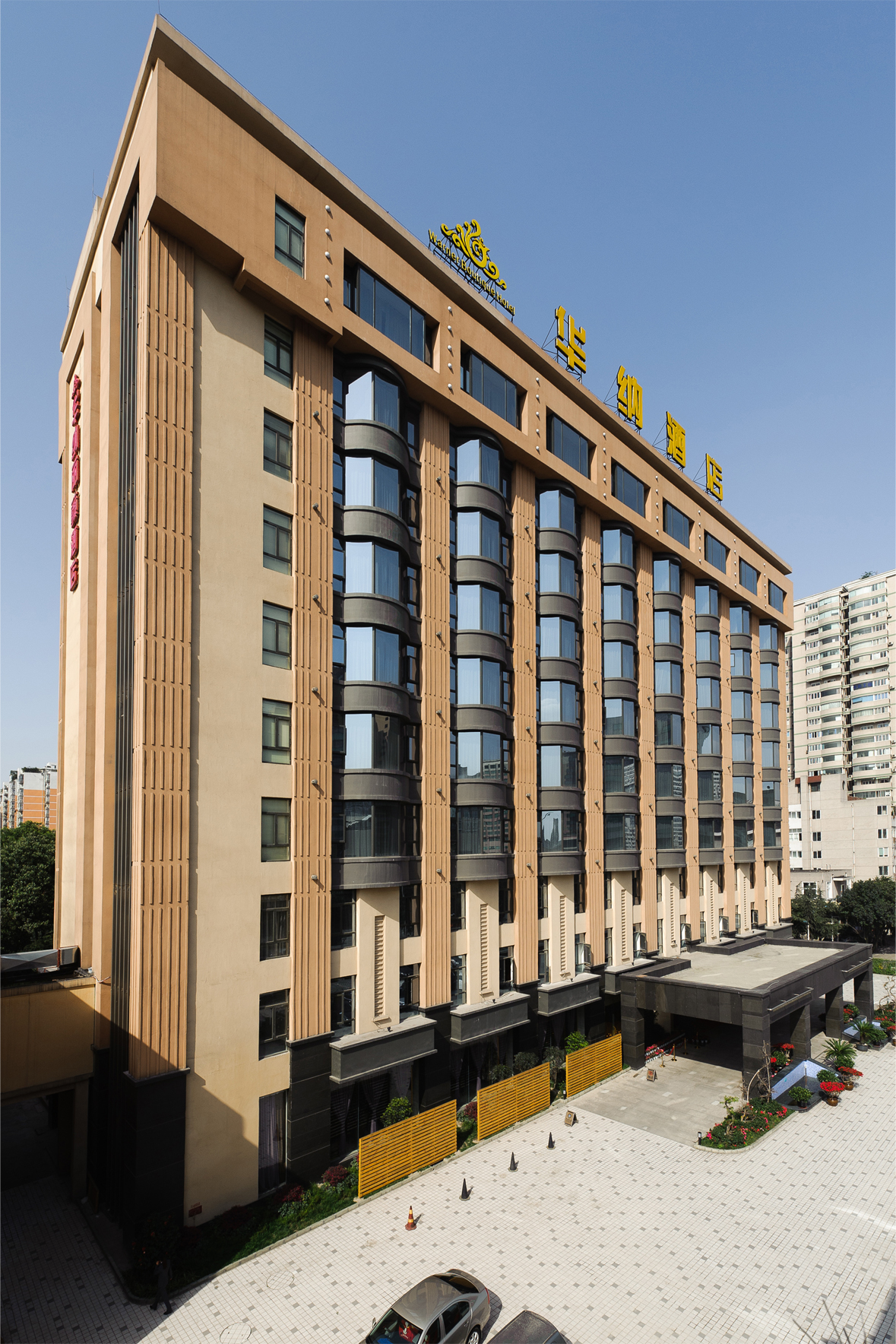 項(xiàng)目位于成都市二環(huán)路南三段與玉林南路交匯處核工業(yè)西南物理研究院內(nèi),占地面積約6790平方米,是集會議、餐飲、休閑、娛樂為一體的四星級商務(wù)酒店,擁有多功能客房300多間。外墻立面采用局部干掛花崗石及板材氟碳漆,弧線形的落地凸窗與豎向立柱形成立面曲直對比,增大了客房的使用空間。設(shè)計(jì)風(fēng)格簡潔明快、典雅莊重,夜景照明采用獨(dú)特的“十字”型樓宇外墻裝飾燈,起到獨(dú)特的標(biāo)識作用。